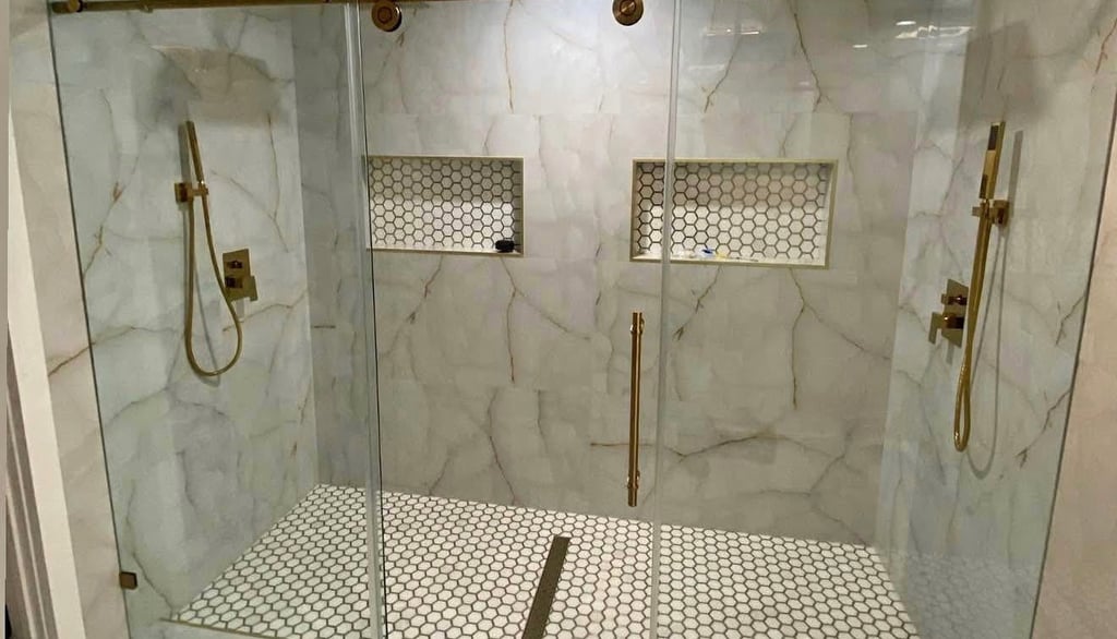 We installed a Roman Shower, otherwise known as a walk-in shower for our client in Santa Ana. We used marble tiles, Rose gold Hardware, Delta hardware and redesigned the entire space for a dual shower set up.